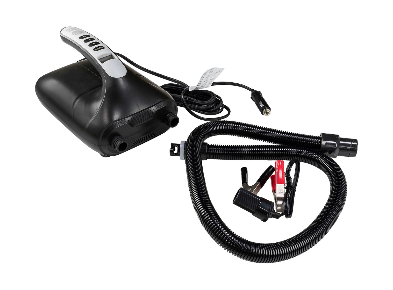 Лодка накачивается в два этапа. Начинает работу первая ступень вентилятора, создающая объём. Затем насос автоматически переключается на поршневой компрессор и доводит давление в изделии до выставленного на задатчике.