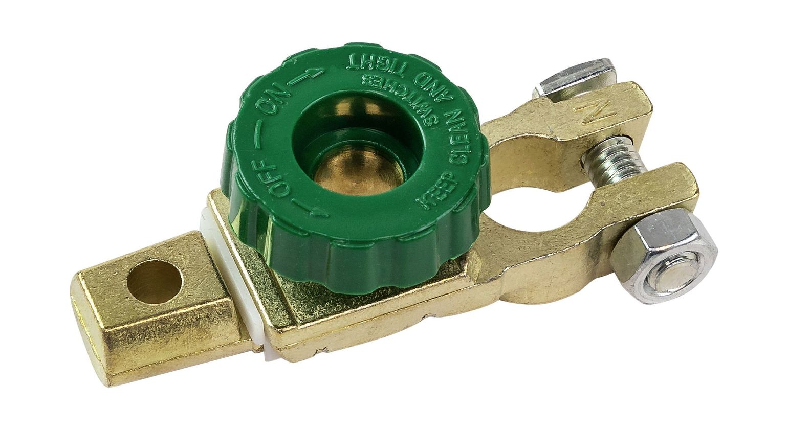 Минусовая клемма для аккумуляторной батарей с выключателем массы. Выключатель массы позволяет отключить питания от аккумулятора не снимая клеммы с отрицательного полюса АКБ. Достаточно повернуть затяжную шайбу на 90 градусов.