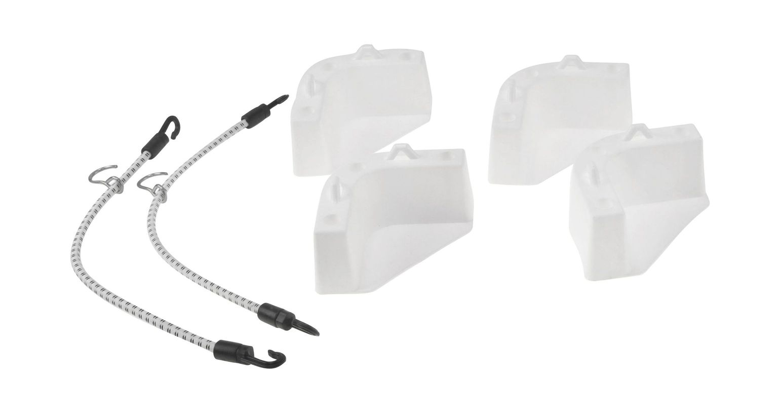 Состоит из четырех пластиковых уголков, и двух нейлоновых шнуров с крючками из нержавеющей стали.