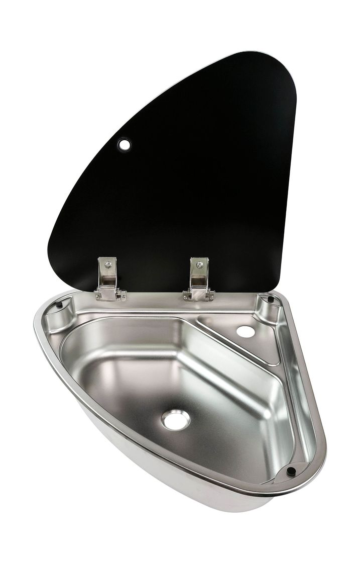 Угловая раковина изготовлена из легкой в уходе и прочной нержавеющей стали. Предназначена для установки кранов внутри чаши. Элегантный, лаконичный дизайн с рабочей крышкой обеспечивает дополнительное рабочее пространство в закрытом состоянии.