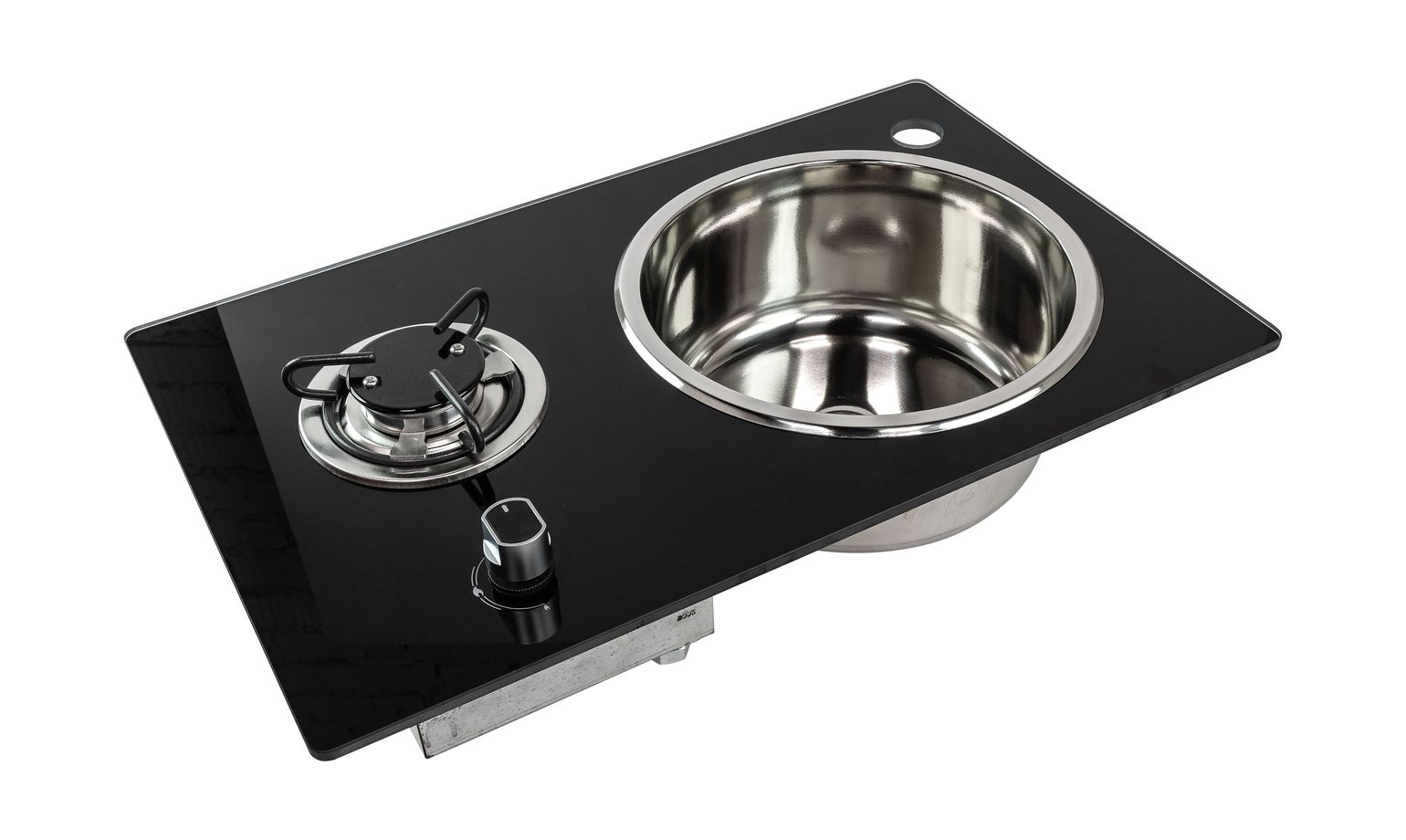 Компактная комбинация встраиваемой варочной панели с мойкой, расположенной справа от газовой конфорки. Горелка мощностью 1.8 кВт работает на сжиженном газе. Закалённое жаропрочное чёрное стекло выглядит стильно. Раковина из нержавеющей стали прочна и легка в уходе. Практичный удобный вариант обустройства камбузного блока на борту катера, яхты или кухни в автодоме (кемпере).